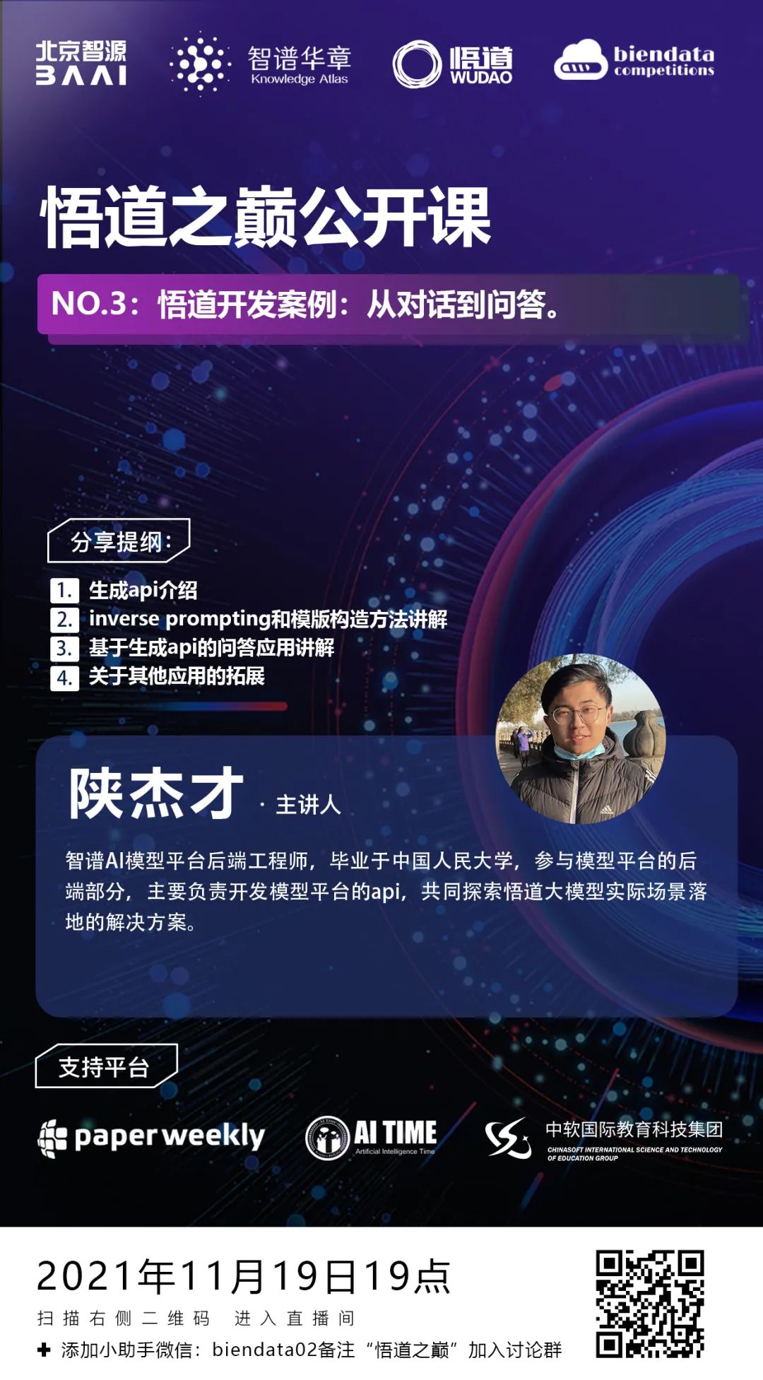 11月19日悟道之巅系列公开课第三讲将于晚7点开课!第三讲课程将由智谱AI模型平台后端工程师陕杰才为大家讲解一个基于悟道开发的智能应用案例