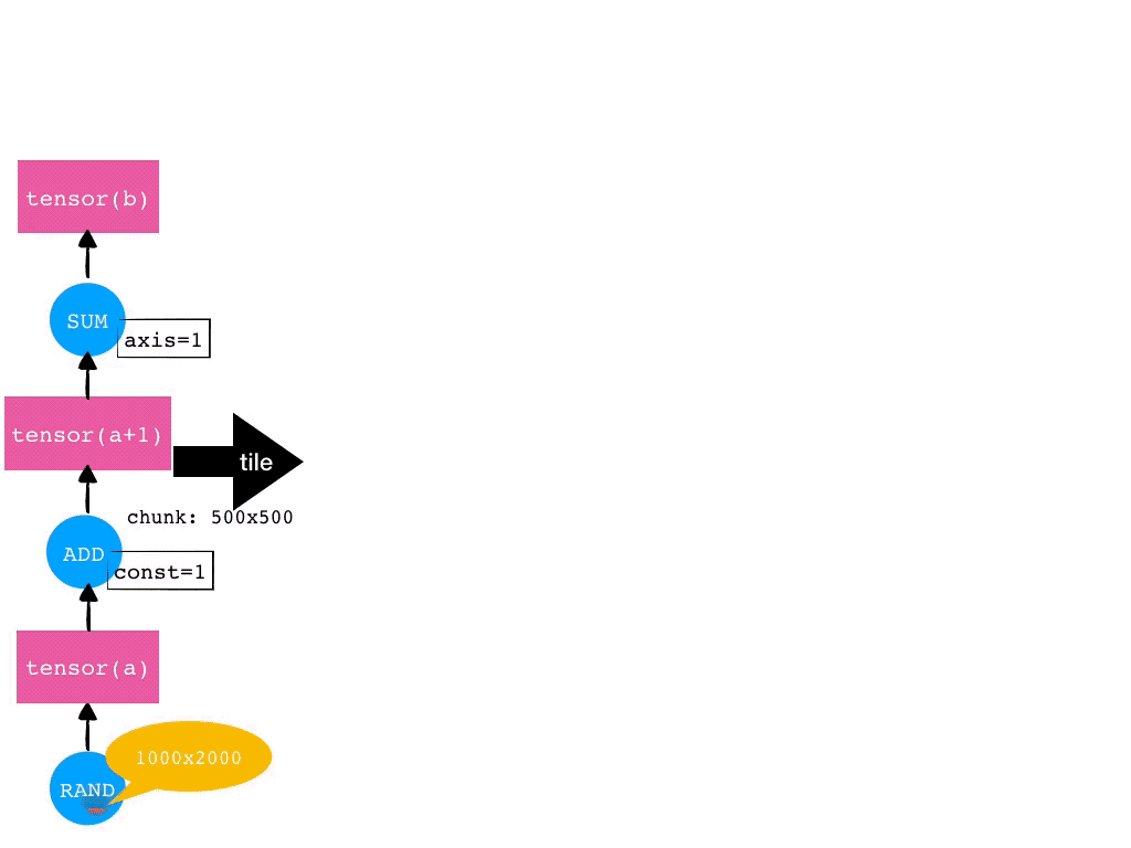 比如,给定一个 1000 * 2000的张量,如果每个维度上的 chunk 大小为 500,那么这个张量就会被 tile 成 2 * 4 一共 8 个 chunk。对于后续的算子,比如加法(Add)和求和(SUM),也都会自动执行 tile 操作。一个张量的运算的 tile 过程如下图所示。
