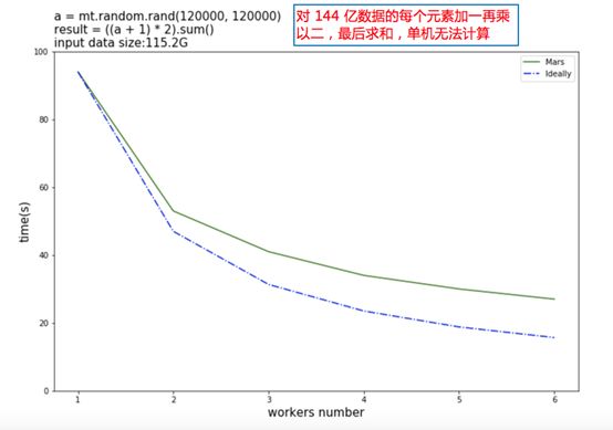下图是进一步扩大计算规模,把数据扩大到144亿元素,对这些元素加一乘以二以后再求和。这时候输入数据就有 115G,单机的 Numpy 已经无法完成运算,Mars 依然可以完成运算,且随着机器的增多可以获得还不错的加速比。
