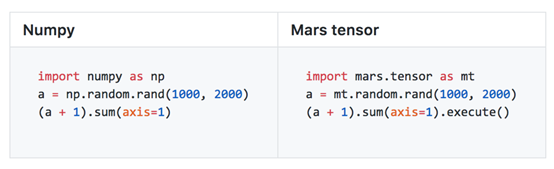Mars 通过 tensor 模块提供兼容 Numpy 的接口,用户可以将已有的基于 Numpy 编写的代码,只需替换 import,就可将代码逻辑移植到 Mars,并直接获得比原来大数万倍规模,同时处理能力提高数十倍的能力。目前,Mars 实现了大约 70% 的常见Numpy 接口。