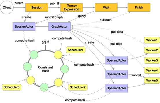 Mars 分布式执行时会启动多个 scheduler 和多个 worker,图中是3个 scheduler 和5个worker,这些 scheduler 组成一致性哈希环。用户在客户端显式或隐式创建一个 session,会根据一致性哈希在其中一个 scheduler 上分配 SessionActor,然后用户通过 execute 提交了一个张量的计算,会创建 GraphActor 来管理这个张量的执行,这个张量会在 GraphActor 中被 tile 成 chunk 级别的图。这里假设有3个 chunk,那么会在scheduler 上创建3个 OperandActor 分别对应。这些 OperandActor 会根据自己的依赖是否完成、以及集群资源是否足够来提交到各个worker 上执行。在所有 OperandActor 都完成后会通知 GraphActor 任务完成,然后客户端就可以拉取数据来展示或者绘图。