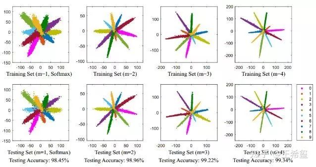 由于L-softmax有一个更加难的实现目标,所以说它更能避免过拟合。同时L-softmax不仅在分类问题上有优势,同样在识别问题上也有优势,因为它使得类内的距离更加的紧凑。 通过控制m的大小,调整类间距离。m越大,类间距离就越大,类内更加紧凑。