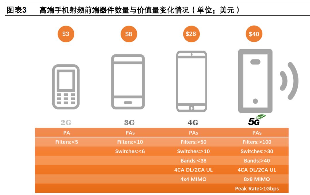 5G 时代已经来临,射频前端或将率先受益。射频前端是手机的核心器件,直接影响着手机的信号收发。平安证券预计5G发展到成熟阶段,使得最终射频模组的成本持续增加。从2G时代的约3美元,增加到3G时代的8美元、4G时代的28美元,预计在5G时代,射频模组的成本会超过40美元。