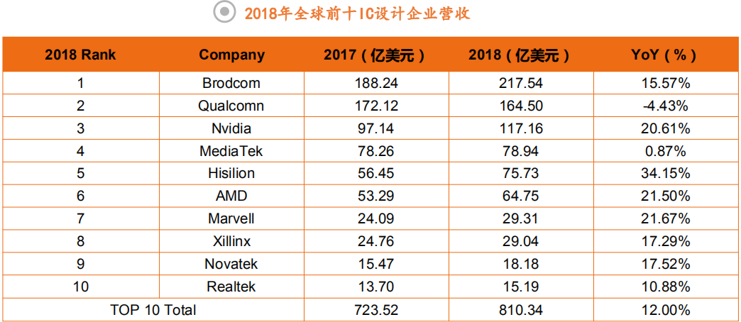 从企业来看,全球前十大芯片设计公司总营收规模达到810亿美元,同比增长12% 。其 中 博通同比增长15.6% , 以217.54亿美元营收居首;高通同比下降了4.4%,以164.50亿美元继续位居第二。