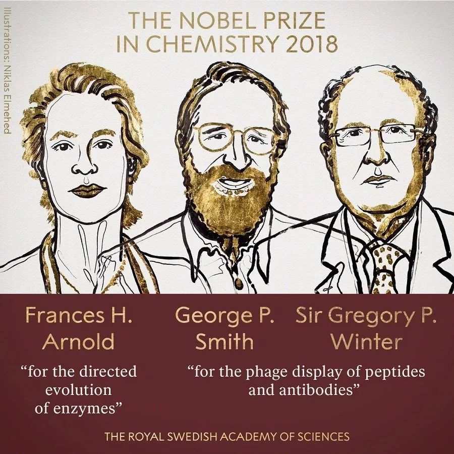 10月3日下午5点45分,2018年诺贝尔化学奖正式揭晓。今年,瑞典皇家学院将化学奖一半颁给了来自美国的科学家Frances H. Arnold,奖励她实现了酶的定向演化;另一半颁发给了George P Smith和Sir Gregory P. Winter,奖励他们实现了多肽和抗体的噬菌体呈现技术。