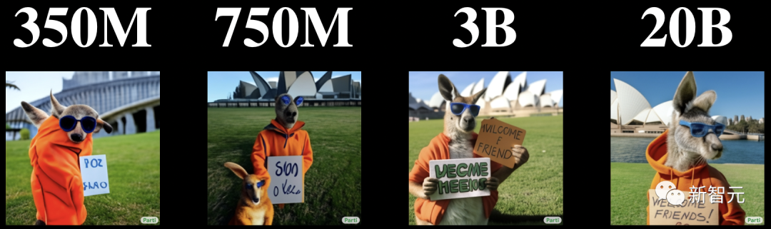 扩展到30亿参数,之前的袋鼠不见了,但举的牌子多了一块,上面的字仍有拼写错误,但大概能看出是「欢迎朋友」了。但背景中的悉尼歌剧院似乎开了「影分身」。