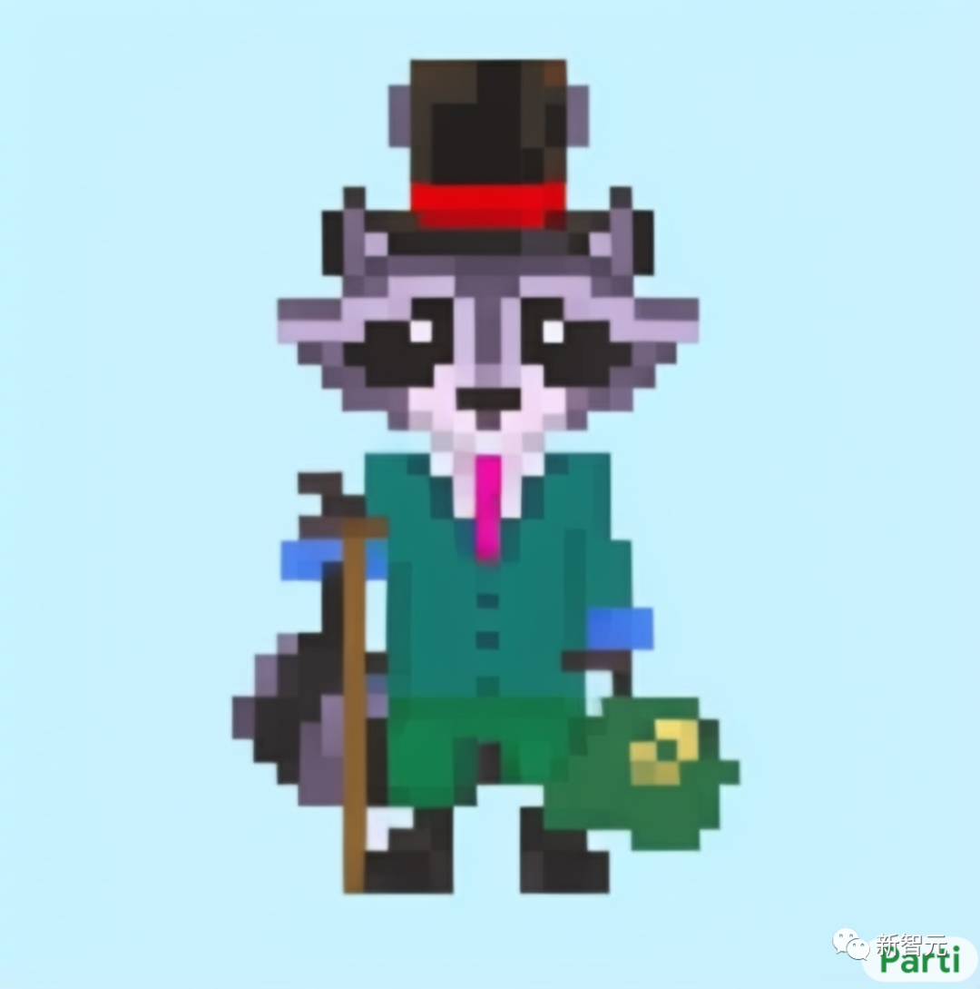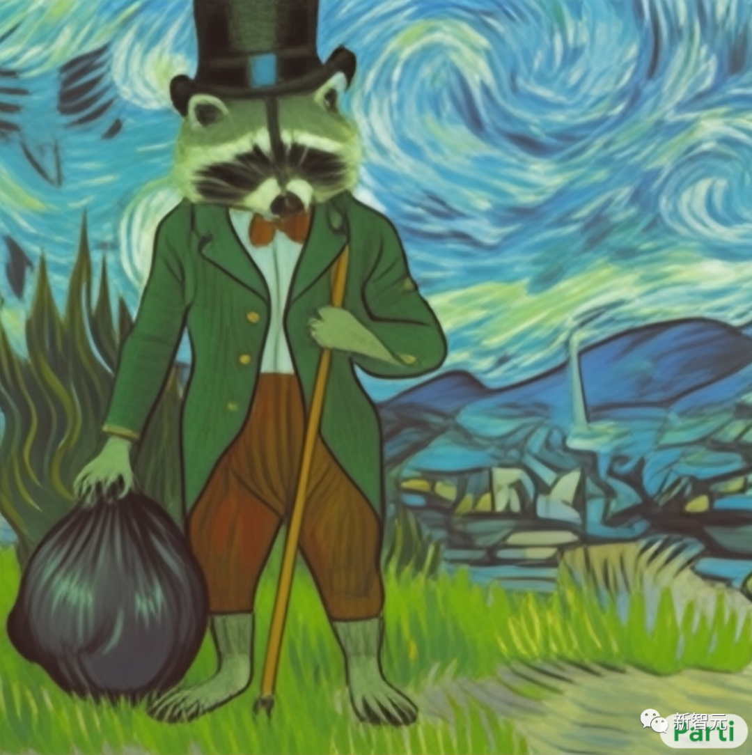 一只浣熊穿正装,头戴礼帽,拄着拐杖,拿着个垃圾袋。