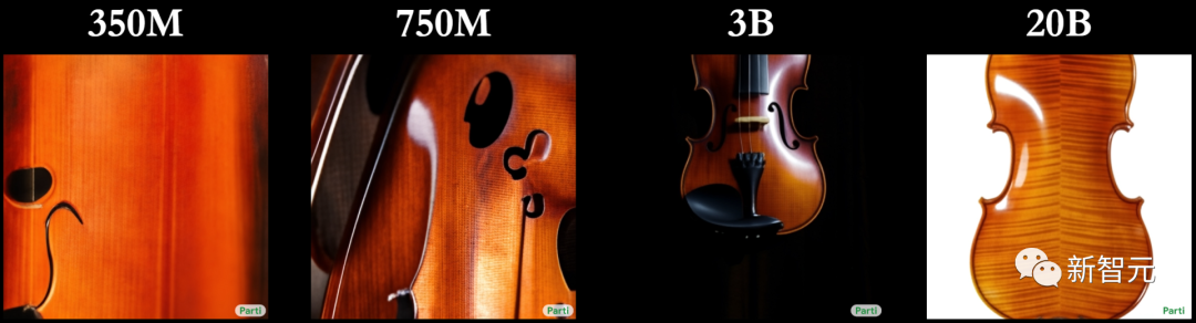 直到30亿参数下,生成的图像仍然是「小提琴的正面」,直到200亿参数下,才生成了正确的图像。