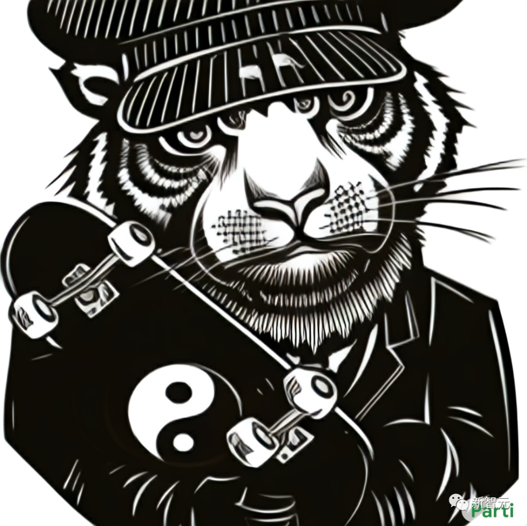 「一只老虎戴着列车长的帽子,手里拿着一块滑板,上面有一个阴阳符号。」