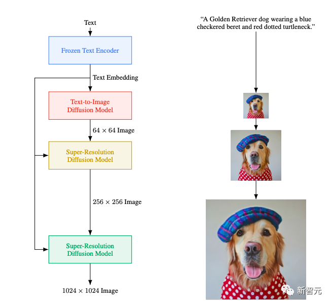 在用户输入文本后,如「一只戴着蓝色格子贝雷帽、穿着红色波点高领毛衣的金毛犬」,Imagen先使用一个冻结(frozen)T5-XXL 编码器将输入文本映射到嵌入序列和64×64图像扩散模型,再将生成的64×64图像上采样为256 × 256图像,最后上采样为1024 × 1024图像。