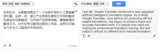 去年秋天,谷歌翻译推出了一个全新升级的人工智能翻译引擎。这样一来,曾以产出语言生硬但又可用的翻译而闻名的谷歌翻译,已开始产出语言流畅、精确度高的翻译文本。对未经专业翻译训练的人来说,这种文本输出几乎与人工翻译并未有区别。以当前这段话为例,翻译结果如图一所示。