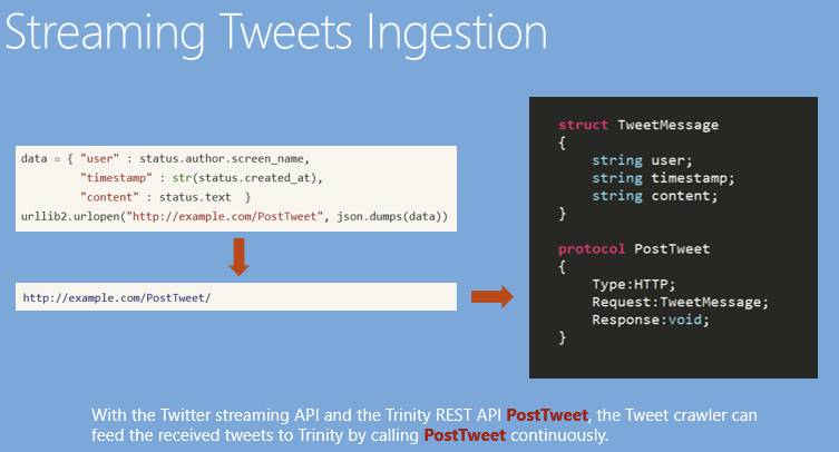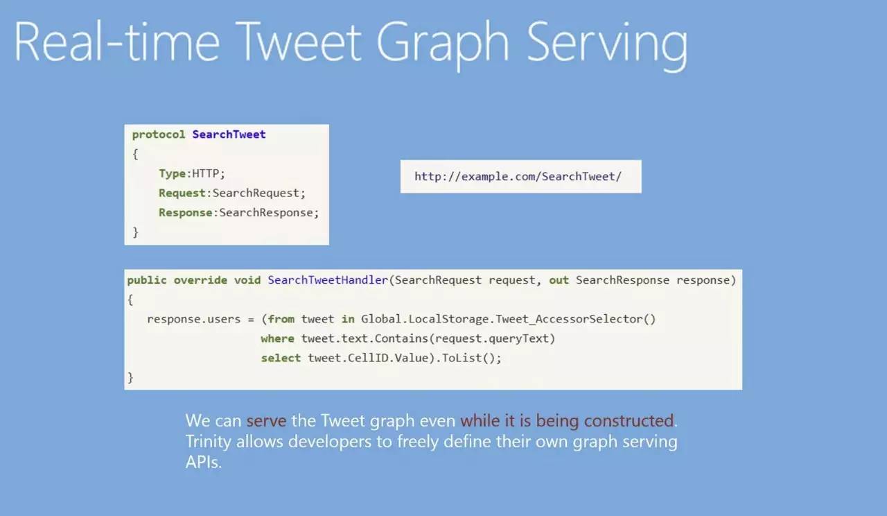 我们可以在Graph Engine上加一个Message Handler,每次Twitter来了一条新的消息,我们就向这个消息协议转发,这个协议(Protocol)可以是同步、异步,或者是内部的协议,也可以是HTTP的协议,所以和其他语言非常好交互。