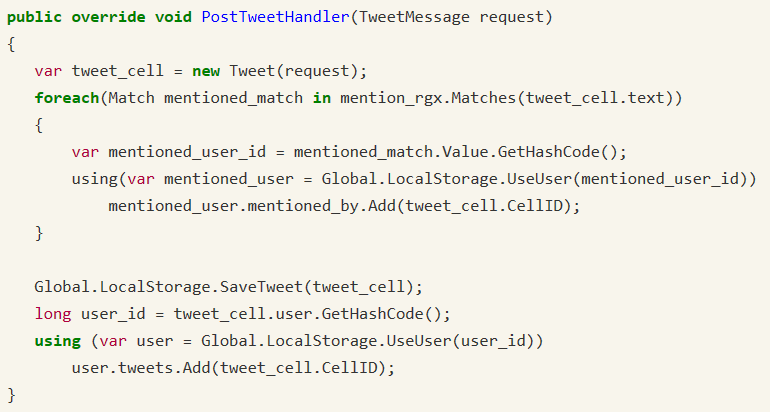 上图可以看到Post Tweet Handler的具体实现。首先从Python方来了一个请求,我们收到了一个推文消息,然后就可以实时在Handler里用正则表达式看有没有提到用户名的部分。如果有,就抽取出来,变成User ID,然后填充相应的关系。以及在此之后,我们会把当前推文存到系统里面。因为Handler不是单线程的调用,系统有一个thread Pool,所以这样的操作可以在一个Handler里实时完成。