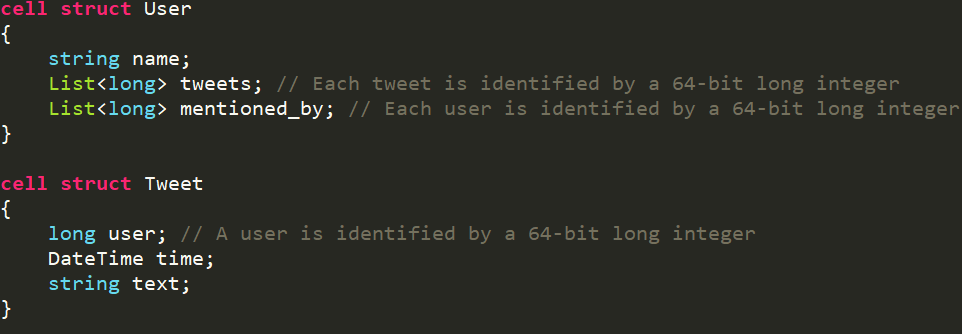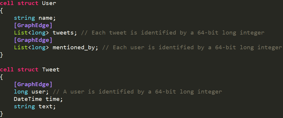 具体来讲,回到刚才的Tweet Graph上,我们有用户和推文两种实体。我们的目标是要把查询语言,就是LIKQ,应用到Tweet Graph,在Tweet Graph上实现图的查询。问题是现在的Schema里只有List<long>,系统不可能见到List<long>就认为它是一个边,然后去遍历,因为这个Long可能还有别的意思,这样是不现实的。