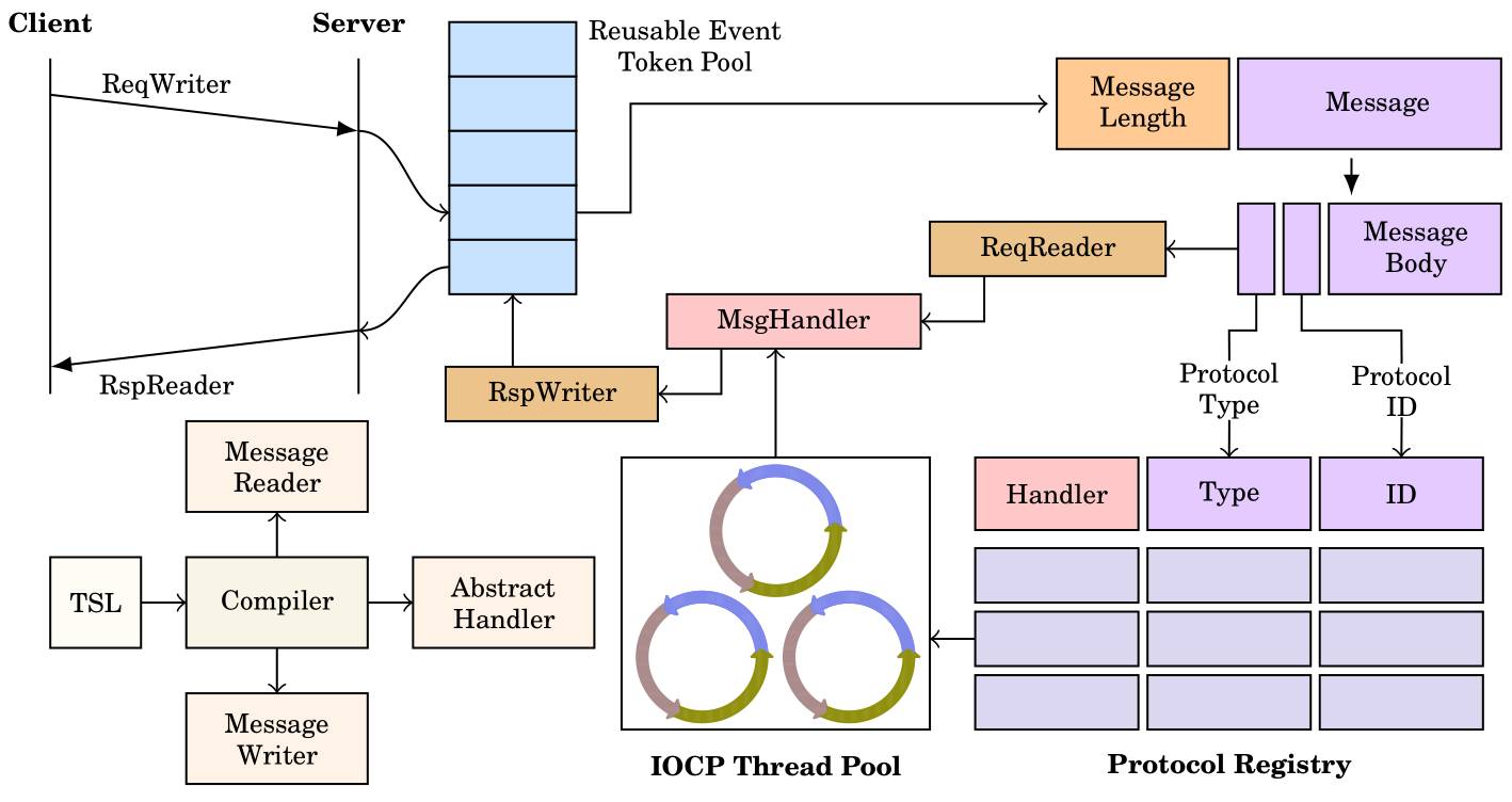 我们注意到,客户端发送的请求ReqWriter以及服务器返回的RspReader,其实都是由TSL编译器生成的。不仅如此,在一个消息到达服务器之后,它有一个调度(Dispatch)的过程,需要把消息翻译成一种数据结构,这里我们可以直接用Data Accessor去读取缓冲器中的内容。所有的辅助过程,包括Handler的抽象接口,都是由TSL Compiler生成的。我们设计系统的目标就是让消息传递(Remote Message Passing)变得尽量简单,就像在本地写GUI程序一样。