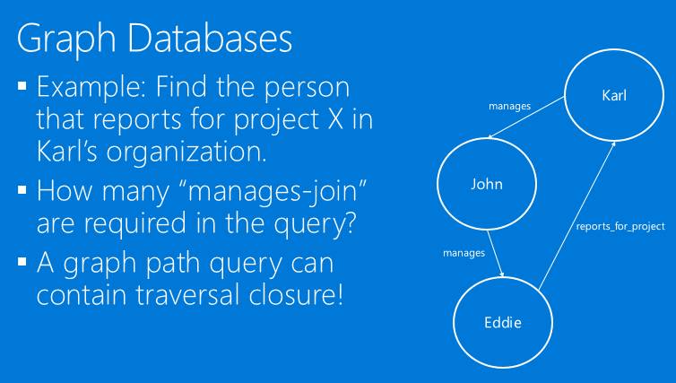 这里的问题是,我们不能确定管理的链条有多长。因为可能是A管着B、B管着C、C管着D,D又向H报告。如果用SQL,就需要把所有的两跳、三跳、四跳以及等等的操作都做一遍,最后再把结果综合。但是在图里面,由于有“闭包”操作,所以我们可以从Karl这个点出发,沿着管理这条路线走,这样走下去一定是报告和管理的关系,而终止条件是找到一个点,它不再管理其他人,或者是它连回了一条边,比如Karl这条报告的边。