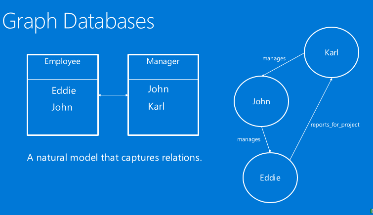 举个例子,左边是一个表,右边是和它等价的图中的关系。我们可以看到这里有三个人,有老板,也有员工。老板会管理员工,员工也会为了某个项目向老板报告,这种数据模型最核心的数据结构就是图。