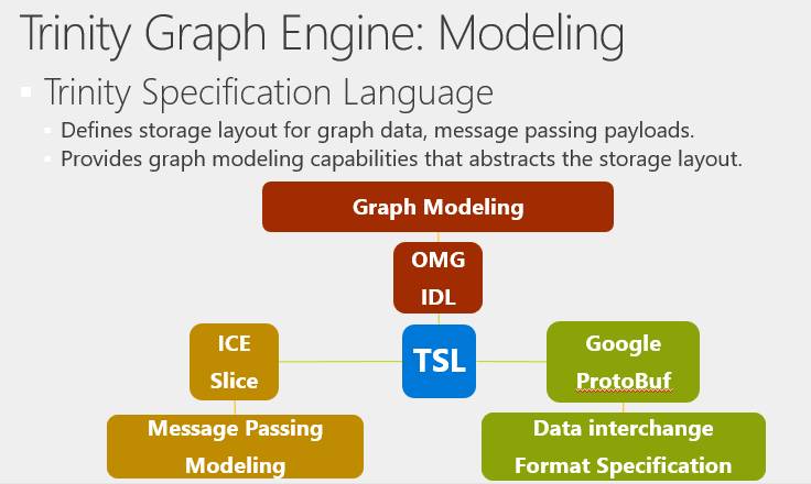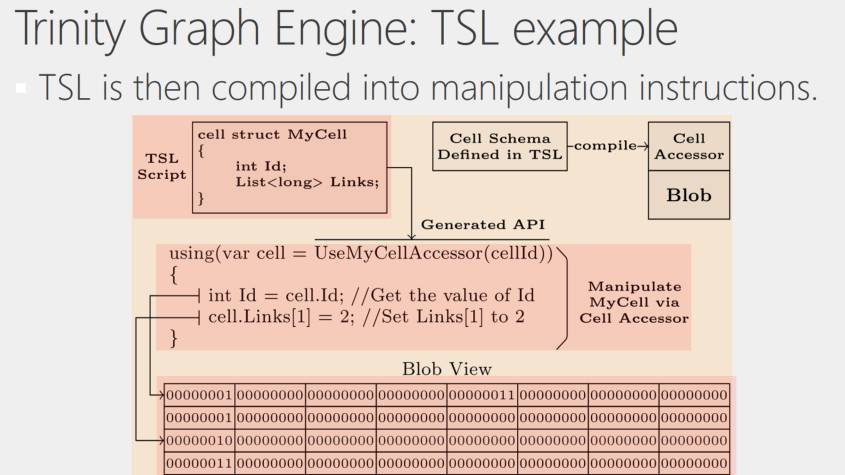 在Graph Engine系统中,我们使用Trinity Specification Language语言,即TSL,来完成以下三种功能。第一个,做数据建模,虽然存储时存成的是一个Blob,但实际上我们有它的数据模式(Schema),并且可以由用户指定,而不是用一些简单的自带数据结构。第二,在做Message passing时,如果期望得到某一种格式的回复,我们可以用TSL来定义消息传递格式。第三,系统和其他外部系统之间需要交互,比如要从C#里传递一个东西,放到Python里,我们也可以通过TSL来进行数据交换,我们可以提供一种标准,作为数据的中间格式。