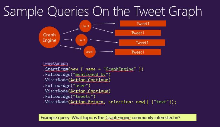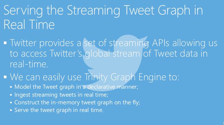 我们可以用这个做什么事情呢?当一条推文来了之后,我们可以把它放到Graph Engine里。在消息处理器中找到这条推文应该存的地方,比如,哪个用户发的,提到了哪些人等等。在做这件事情的同时,实体间的关系就建立起来了,因为一个用户发了一个推文,会有一个关系连到一条边,如果推文里提到了其他人,那么系统就不仅是存下了这条信息,还可以把所有关系都实时建立起来。