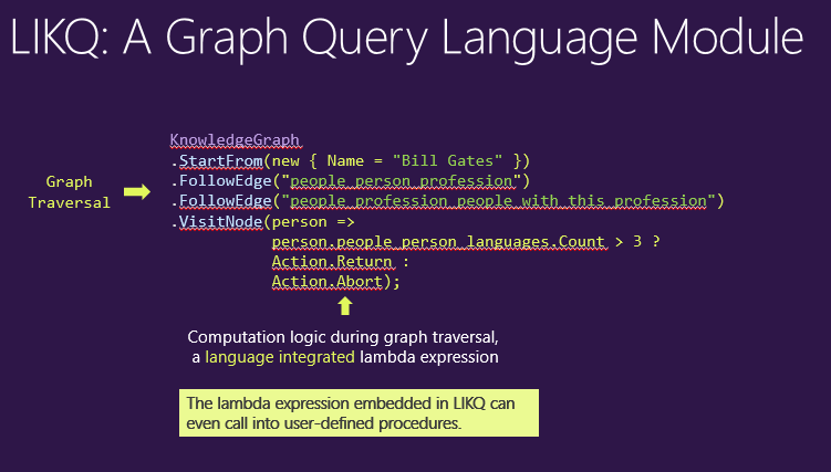 接下来我们看一下具体的图查询语言,即LIKQ 。LIKQ是一个直接可以嵌入编程语言的查询语言,它和LINQ很像,都有一个很流畅的语法,可以直接写在编程语言里。