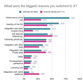 如下图所示,开发人员之所以改用 VS Code 主要原因包括:性能(82%)和可用性(63%)。另一方面,用户切换到 Android Studio 主要是因为:功能(51%)、与 Flutter 工具的集成(39%)、与原生平台的集(27%)。