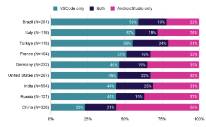通过调查,我们还发现来自不同国家或地区的 Flutter 开发人员喜欢的 IDE 也不同。虽然大多数 Flutter 开发人员更喜欢 VS Code,但中国的开发人员更喜欢 Android Studio(56%),喜欢 VS Code 的开发人员只有 23%。