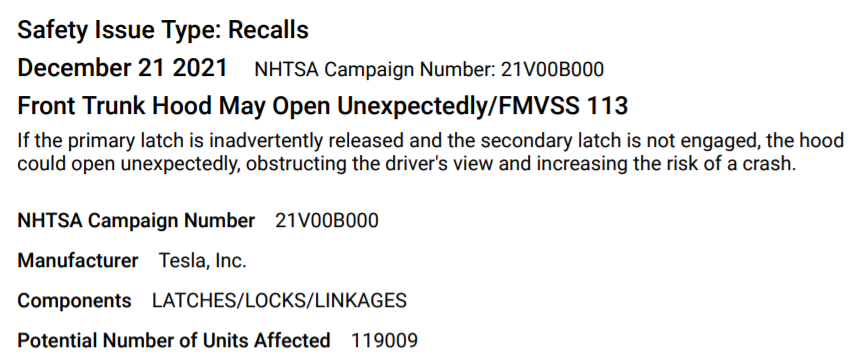 Model S的问题是前引擎盖的锁未对准,可能导致引擎盖无法正常锁闭,会突然打开阻挡驾驶员视线,增加撞车风险。