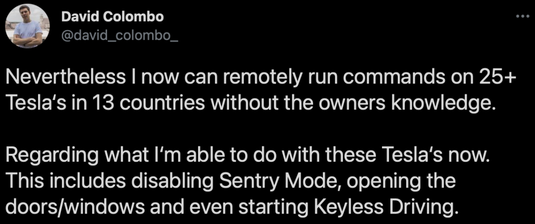 我现在可以在车主不知情的情况下对13个国家的25辆以上的特斯拉进行远程控制。这包括禁用哨兵模式,打开车门/车窗,甚至启动无钥匙驾驶。