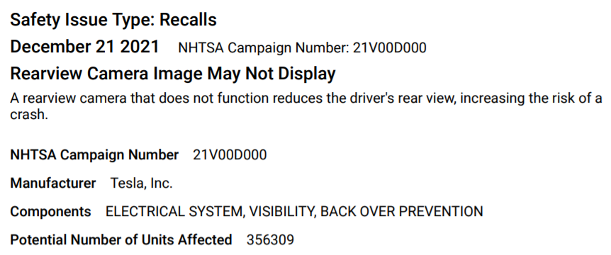 最近一次的大规模召回涉及356309辆Model 3和119009辆Model S ,原因是车辆的后视摄像头和前引擎盖存在潜在的故障风险。