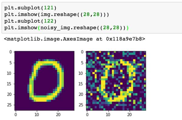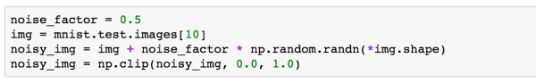 我们通过上面一个简单的例子来看一下如何加入噪声,我们获取一张图片的数据img(大小为784),在它的基础上加入噪声因子乘以随机数的结果,就会改变图片上的像素。接着,由于MNIST数据的每个像素数据都被处理成了0-1之间的数,所以我们通过numpy.clip对加入噪声的图片进行clip操作,保证每个像素数据还是在0-1之间。