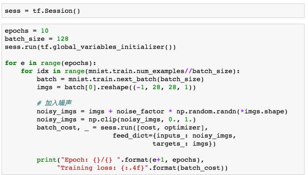 通过上面的步骤我们就构造完了整个卷积自编码器模型。由于我们想通过这个模型对图片进行降噪,因此在训练之前我们还需要在原始数据的基础上构造一下我们的噪声数据。