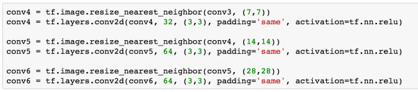 在TensorFlow中也封装了对Upsample的操作,我们使用resize_nearest_neighbor对Encoder卷积的结果resize,进而再进行卷积处理。经过三次Upsample的操作,我们得到了28 x 28 x 64的数据大小。最后,我们要将这个结果再进行一次卷积,处理成我们原始图像的大小。