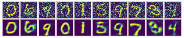 有些小伙伴可能就会想,我们也可以用基础版的input-hidden-output结构的AutoEncoder来实现降噪。因此我也实现了一版用最简单的input-hidden-output结构进行降噪训练的模型(代码在我的GitHub)。我们来看看它的结果: