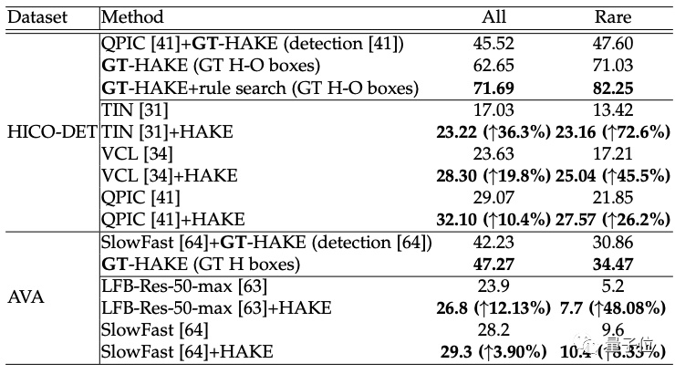 结果,HAKE,在HICO-DET上大大提升了以前的实例级方法,特别是在稀有集上,比TIN提高了9.74mAP(全类平均精度),HAKE的上限GT-HAKE也优于最先进的方法。