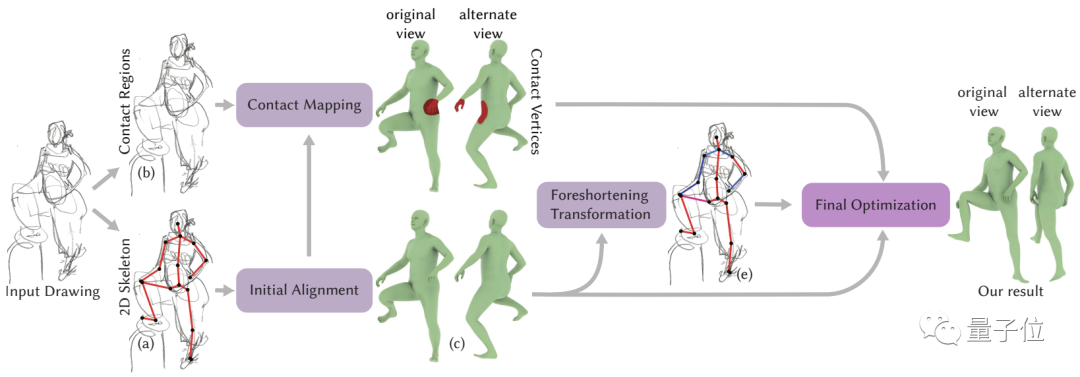 根据这三者预测,再使用最先进的优化框架(optimization framework),并用专门设计的一种新的损失(loss)来平衡姿势自然度,以及与输入草图的相似性,AI就能最终推断出符合画者意向的3D姿势。