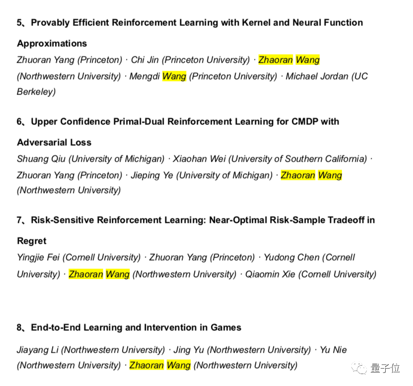 德克萨斯大学奥斯汀分校的汪张扬、普林斯顿大学的杨卓然则有8篇论文接收数。