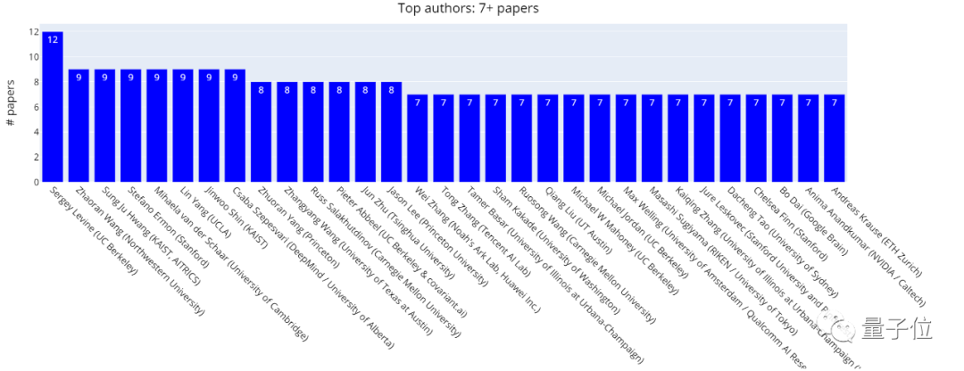 「Top authors」榜单中,论文接受数最高的,是来自加州伯克利分校的助理教授Sergey Levine,任职于电气工程与计算机科学系,今年共有