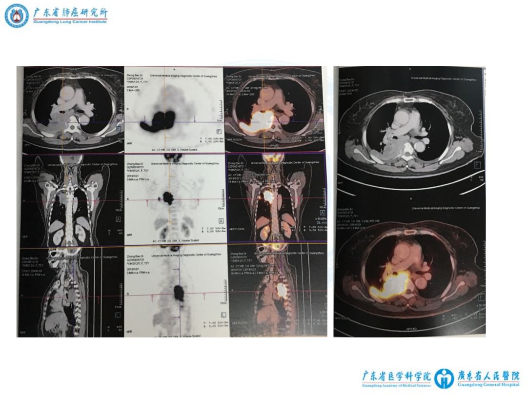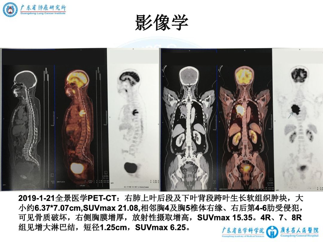 3)2019-1-21全景医学PET-CT:右肺上叶后段及下叶背段跨叶生长软组织肿块,大小约6.37cm×7.07cm,SUVmax 21.08,相邻胸4及胸5椎体右缘、右后第4~6肋受侵犯,可见骨质破坏,右侧胸膜增厚,放射性摄取增高,SUVmax 15.35。4R、7、8R组见增大淋巴结,短径1.25cm,SUVmax 6.25。