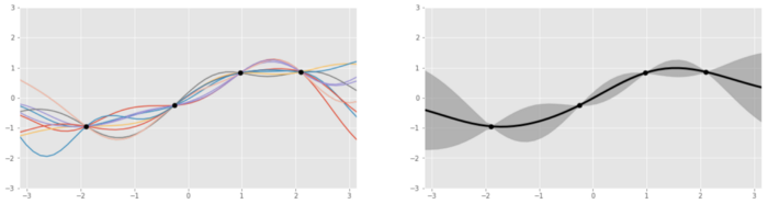 左图:基于 4 个数据点生成的几个基于高斯过程的函数;右图:将这些函数聚合之后。