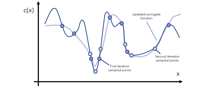 我们可以根据代理函数来识别哪些点是有潜力的最小值。然后我们在这些有潜力的区域执行更多采样,然后据此更新代理函数。
