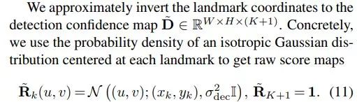 在如图公式中,Dk(u,v) 意思是第 k channel 中坐标为 (u,v) 的值,Dk 是 weight map,与对应坐标相乘,再除以总的权重和坐标乘积的和,从而生成该 channel 的 landmark 的 normalized 坐标。