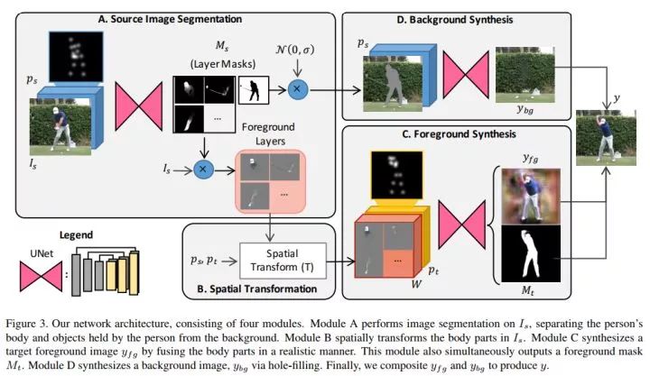 网络的输入是 original img,original pose,target pose,并预设 original img 和 target img 背景一样,人是同一个。 首先前后景分离,然后针对前景(即人),针对身体的不同部分做细致的 segment。