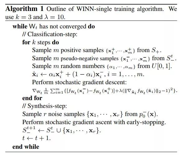 上图为分类过程 loss 的设计,图中两个公式,前者是目标函数,很容易理解,后者则是正则项,正则项是以随机的 a 来生成真数据(x+)与生成的假数据(x-)的 mixture。