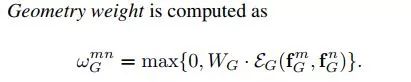 第二步则是将该特征用 wG 映射到 scalar weight,max 的使用起到了类似 RELU 的作用,对几何关系表示的权重做了一个限制。