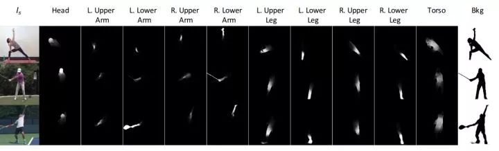 分前后景,前景又对应着已经定义好了的身体部分(10 个)。采用 u-net,输入是 original img 和 pose 的 concat,输出是各个部分的 mask。