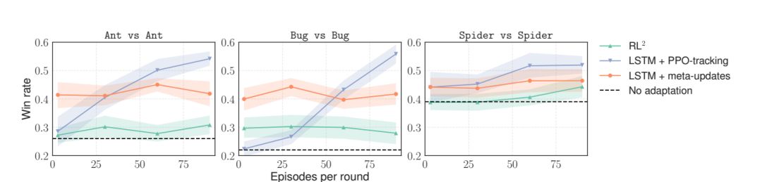2. 在迭代游戏中,轮数和从对手学习到的结果如图3所示,从图中可以看出,当每一轮的迭代次数超过50次时,通过技术追踪的适应问题就变成了“测试的同时进行学习”的问题,除此之外,它可以与一些训练时从未见过的对手进行竞争。在few-shot和标准两种学习制度下,元学适应策略的执行结果几乎都是相同的。这表明,元学习策略在训练时可以学到一种特殊的偏置,使它能够从有限的经验中表现得更好,但也限制了它利用更多数据的能力。