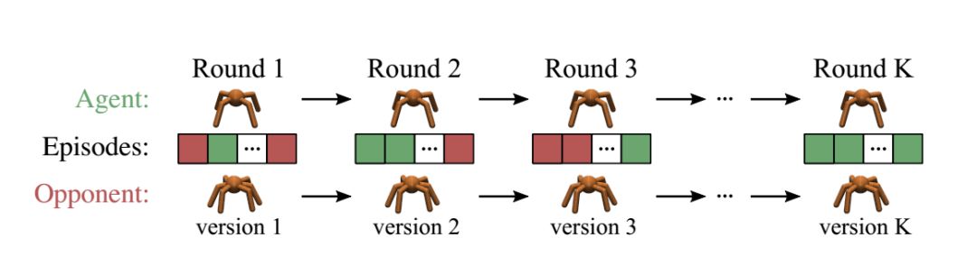 下图表示在一轮包含多局的迭代适应游戏中,一个agent与其对手竞争。如果它在一轮中赢了多局(用颜色来表明胜败),那么它就赢了一局。agent和他们的对手可以在不断地改变策略。