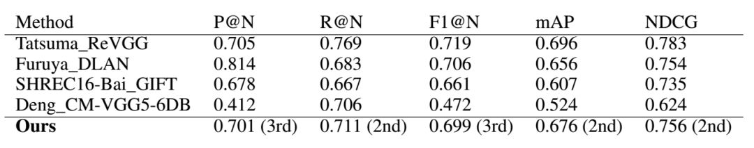 文中使用官方指标评估提出的训练模型,并与每个类别的前三个最优模型进行比较,结果如表1所示。除了精度和F1@N,本文提出的模型排名第三,它是每个其他指标上的都处于领先位置。主要的竞争对手,Tatsuma_ReBGG和Furuya_DLAN使用对SHREC17任务专门设计的特征和网络结构。考虑到文中提出的模型的任务不可知的体系结构和模型中使用的有损的输入表示,可以将模型的性能解释为对球形CNN的有效性的强大的经验支持。