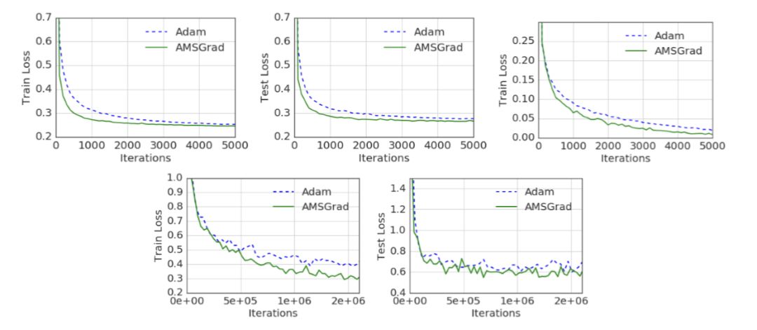 如图2所示,在逻辑回归、前馈神经网络和CIFARNET中对Adam和AMSGRAD的性能比较。上面一行显示了ADAM和AMSGRAD在逻辑回归(前两个图)和隐藏层=1的前馈神经网络(右图)的性能。在最下面一行中,这两图比较了Adam和阿AMSGRAD训练和测试,并基于CIFARNET进行了比较。