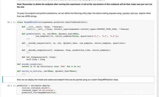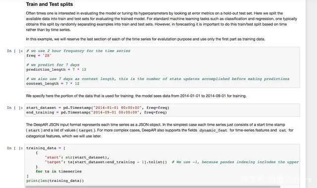 SageMaker 也提供了数个 DeepAR 相关示例,可以在初期仿照示例笔记本处理自己的业务数据并生成模型,降低学习曲线。